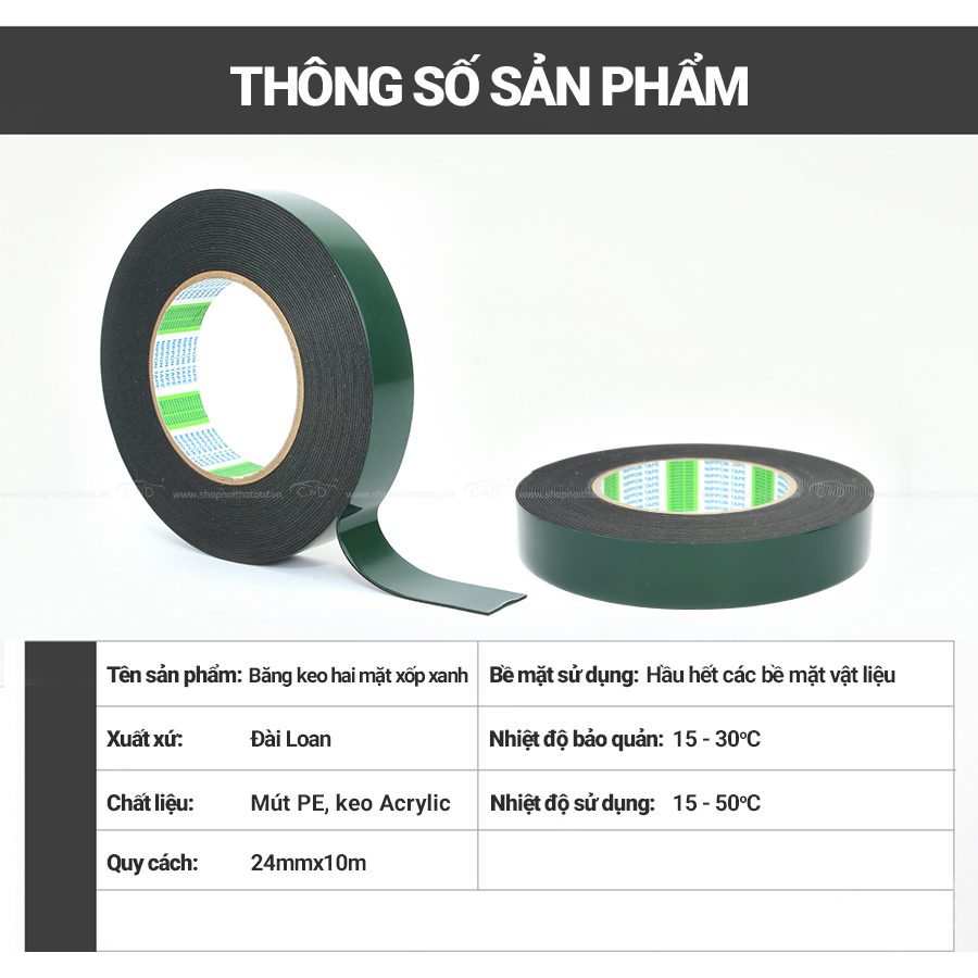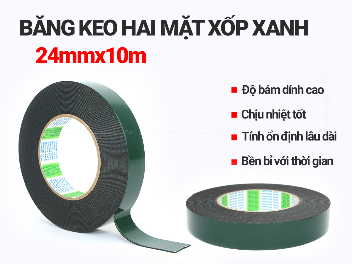 Băng keo hai mặt xốp xanh (24mmx10m) sử dụng hữu hiệu cho xe hơi và trong nhà có tác dụng cố định các đồ vật hoặc liên kết các bề mặt với sự kết dính cao, hỗ trợ việc thay thế các mối hàn cũ mà không để lại các dấu vết hư hỏng trên bề mặt sử dụng.