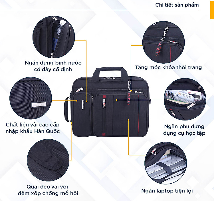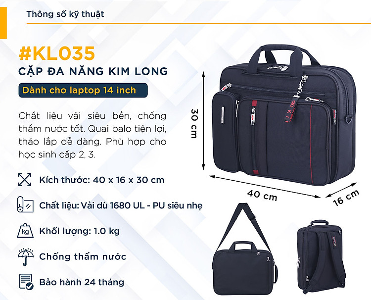 - Cặp đa năng Kim Long KL035 gồm 3 ngăn chính rộng rãi giúp bạn thoải mái đựng đồ đạc, tài liệu. Ngăn đựng laptop có dây cố định giúp bảo vệ laptop khỏi va đập