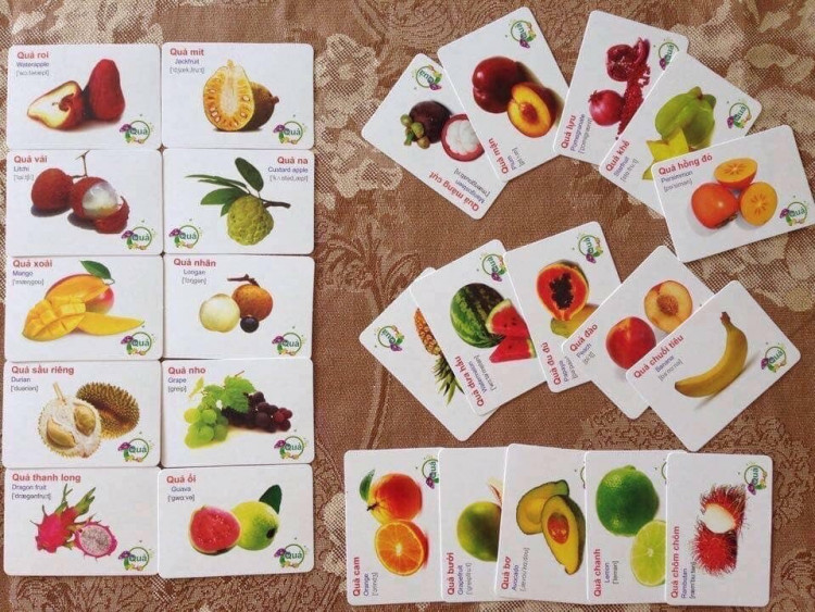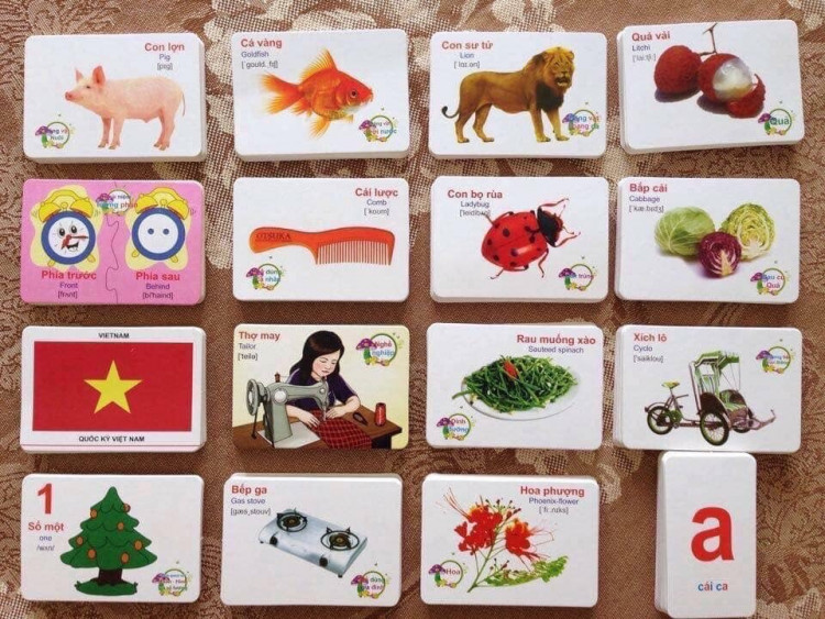 Bộ thẻ gồm 16 chủ đề như: đồ dùng cá nhân, hoa, côn trùng, dinh dưỡng, quả, màu sắc hình khối, nghề nghiệp, quốc kỳ các nước, đồ dùng gia đình, động vật nuôi, rau củ quả, động vật hoang dã, phương tiện giao thông, động vật dưới nước, khái niệm tương phản, chữ cái-chữ số.