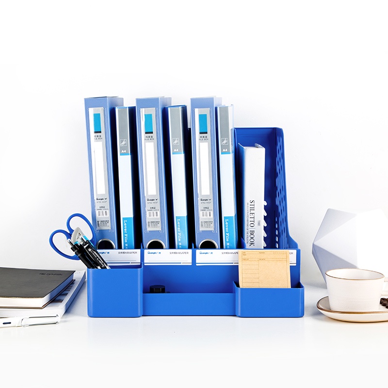 ✔️ Giá tài liệu 4 ngăn kèm ống cắm bút màu xanh + Ghi Guangbo WJK9279B,G là sản phẩm tiện dụng, thường được dùng trong các văn phòng công sở, trường học để cất giữ, bảo quản, phân loại các giấy tờ, tài liệu quan trọng. Sản phẩm thiết kế 4 ngăn có thể đựng được nhiều tài liệu khác nhau giúp bạn có một nơi học tập, làm việc chuyên nghiệp và gọn gàng.