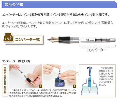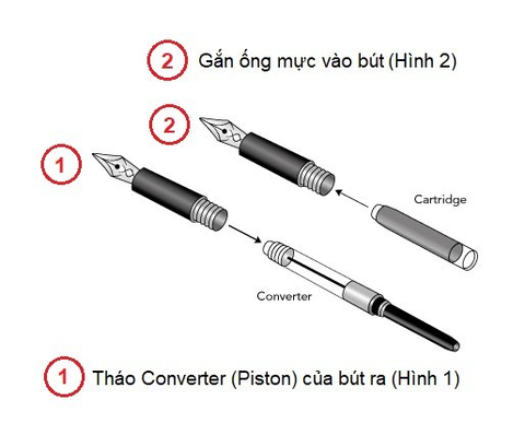 Cắm conveter thay cho ống mực của bút, sau đó xoáy vặn conveter để hút mực từ lọ. Conveter sẽ thay luôn ống mực đi kèm bút