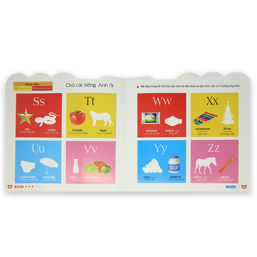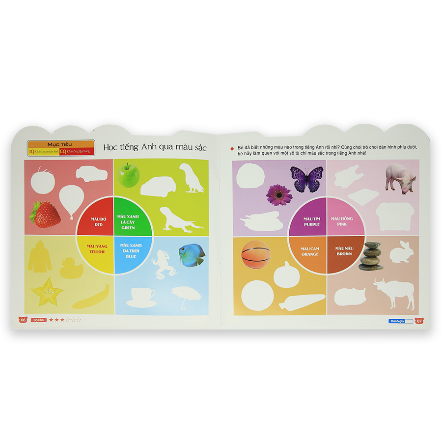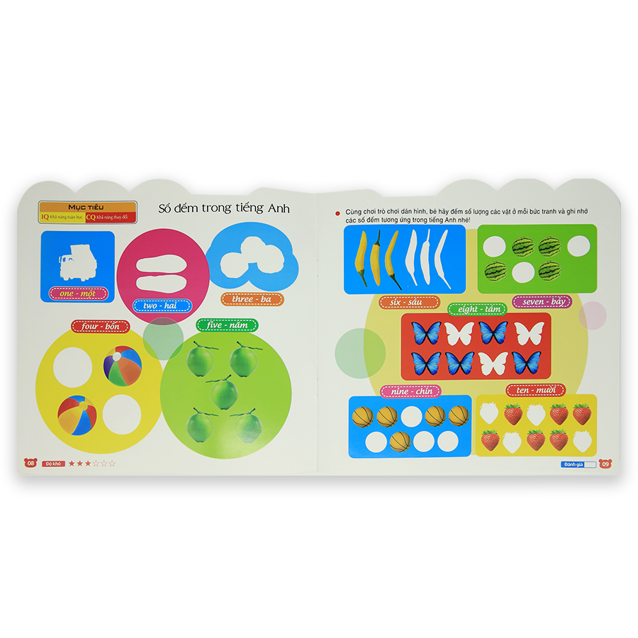 - Đây là một sản phẩm giáo dục sáng tạo, kết hợp giữa việc học tiếng Anh và rèn luyện trí thông minh một cách hiệu quả. Với 208 miếng dán hình ảnh sinh động và các hoạt động đa dạng, cuốn sách sẽ giúp bé làm quen với tiếng Anh một cách tự nhiên và thú vị.