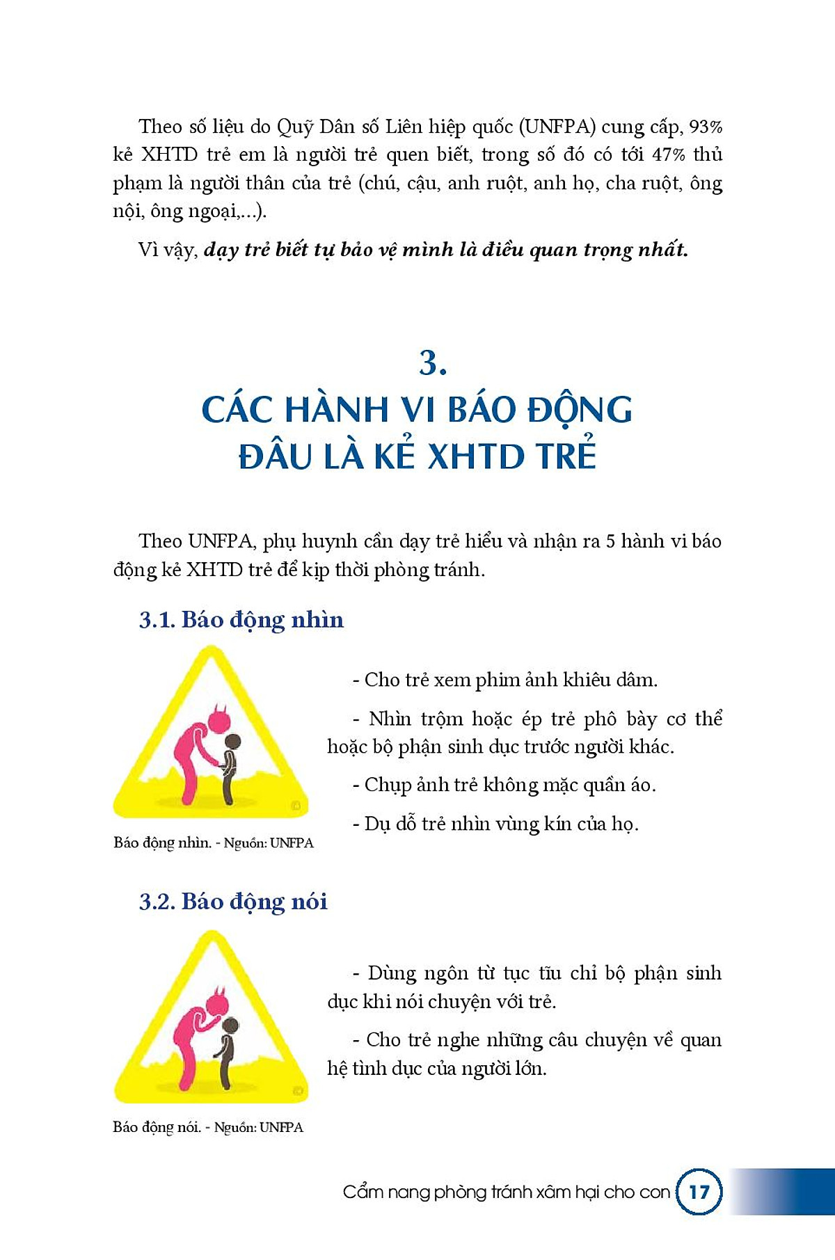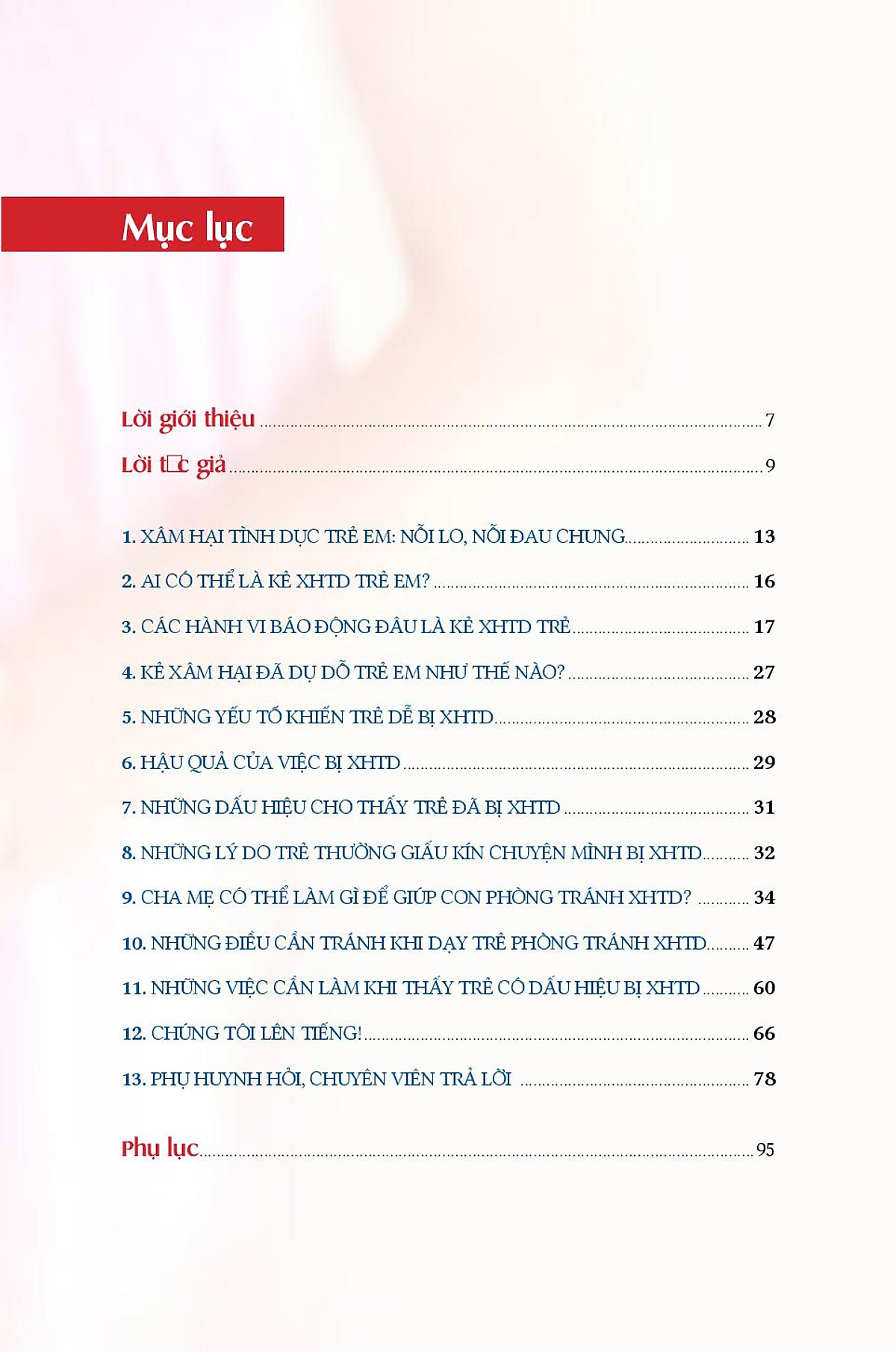 • Đã đến lúc chúng ta không thể chỉ thở dài suông và thầm mong “Con/em/cháu của mình luôn được an toàn!” khi đọc những tin tức khủng khiếp, đau lòng về XHTD trẻ em. Bởi, sự an toàn không phải đạt được chỉ bằng niềm tin hay nguyện ước mà phải bằng những nỗ lực tích cực - đúng đắn phòng chống hiểm nguy. Đó cũng chính là điểm xuất phát cho hành trình ra đời cuốn sách này.