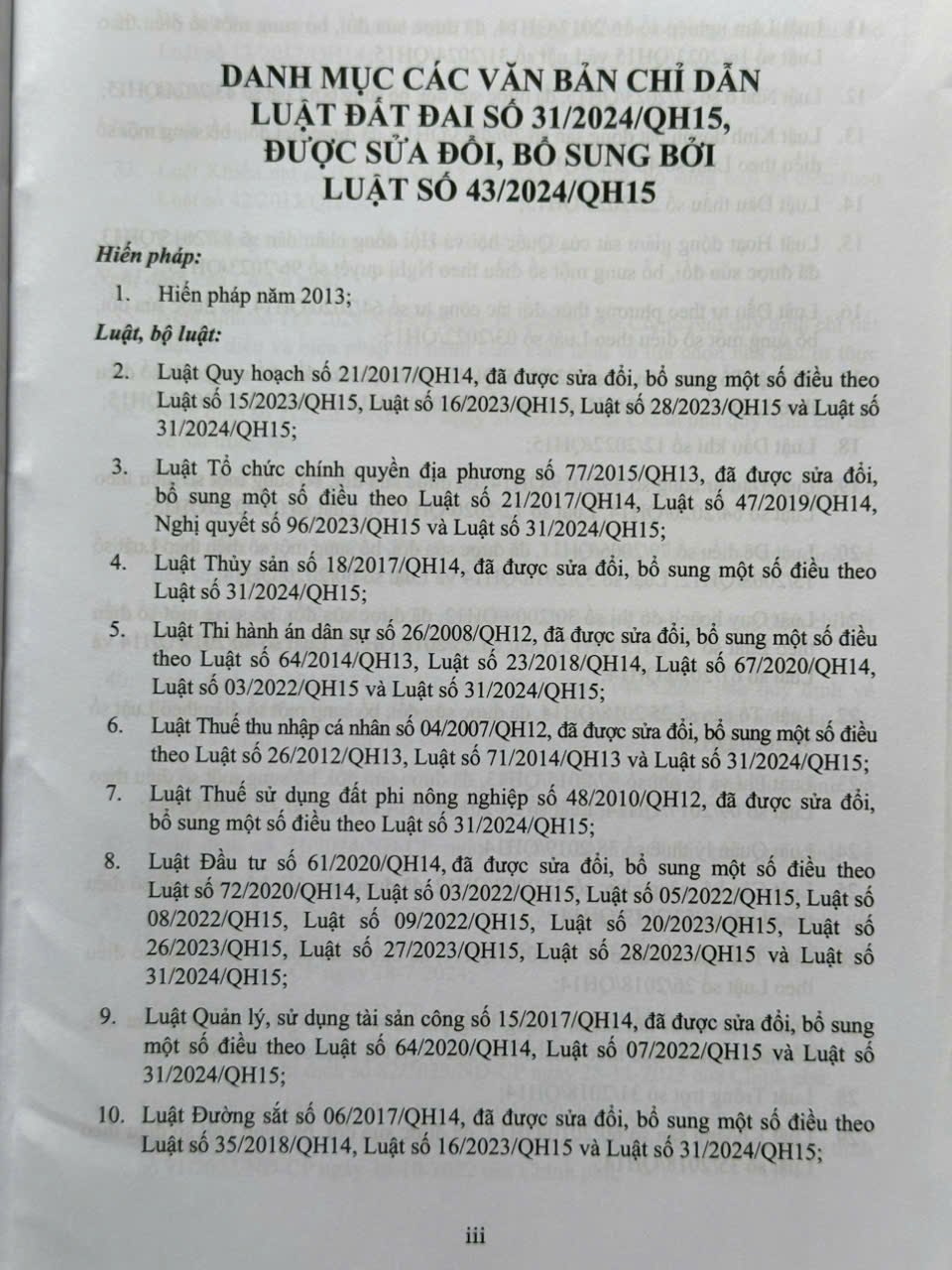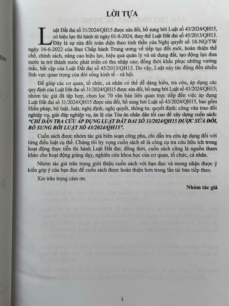 Để giúp các cơ quan, tố chức, cá nhân có thể dễ dàng hiểu, tra cứu, áp dụng các quy định của Luật Đất đai số 31/2024/QH15 được sửa đối, bổ sung bởi Luật số 43/2024/QH15; nhóm tác giả đã tập hợp, chọn lọc 70 văn bản liên quan trực tiếp đến việc áp dụng Luật Đất đai số 31/2024/QH15 được sửa đối, bố sung bởi Luật số 43/2024/QH15, bao gồm Hiến pháp, Bộ luật, Luật, Nghị định, Nghị quyết, Thông tư, Quyết định; Công văn trao đổi nghiệp vụ, giải đáp nghiệp vụ, án lệ của Tòa án nhân dân tối cao để xây dựng cuốn sách: CHỈ DẪN TRA CỨU ÁP DỤNG LUẬT ĐẤT ĐAI SỐ 31/2024/QH15 ĐƯỢC SỬA ĐỔI, BỔ SUNG BỞI LUẬT SỐ 43/2024/QH15