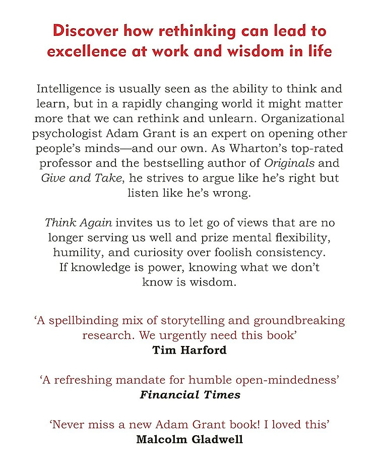 Think Again is a book about the benefit of doubt, and about how we can get better at embracing the unknown and the joy of being wrong. Evidence has shown that creative geniuses are not attached to one identity, but constantly willing to rethink their stances and that leaders who admit they don't know something and seek critical feedback lead more productive and innovative teams.