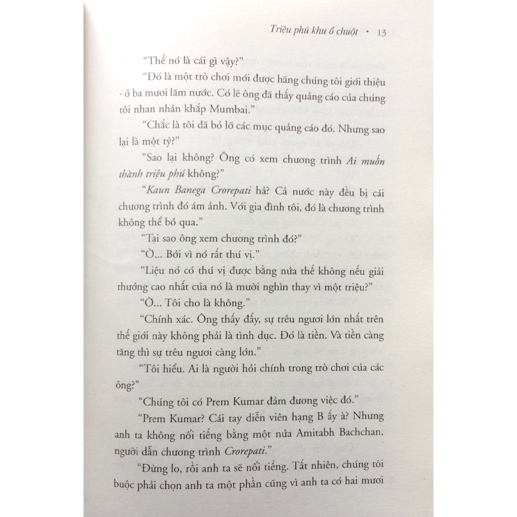 Triệu Phú Khu Ổ Chuột (Tái Bản 2018) Mỗi chương truyện là một cuộc phiêu lưu, bằng cách kể nhẩn nha, chi tiết, ít bày tỏ xúc cảm trực tiếp, Thomas chậm rãi tua lại cuốn băng của cuộc đời mình để rồi viết lên bài ca của nỗi thống khổ và lòng nhân ái. Cái gọi là đồng xu may mắn thực ra cả 2 mặt đều ngửa, cái gọi là chớp lấy may mắn thực ra đều do con người chủ đích tạo nên, cái gọi là lòng nhân ái thực sự ẩn sâu trong những cử chỉ cao đẹp nhất giữa người với người, cho dù, họ là những người tồn tại bất hợp pháp trong cuộc đời mình. Hình ảnh Thomas đấu tranh đến phút cuối cho mạng sống của Shankar đang bị bệnh dại hành hạ, những câu nói trôi chảy nhất trong cuộc đời của một hoàng tử bị bỏ quên là về chính người mẹ - bà hoàng đã cố tình quên đi sự tồn tại của cậu; Thomas, người không ngớt bị ám ảnh phải kiếm bằng mọi giá số tiền 400.000 rupi lại dễ dàng cho một người không quen toàn bộ số tiền ấy để ông ta mua thuốc cho con trai bị bệnh dại; Thomas, con người sẵn sàng đánh đổi cả mạng sống của mình để trả thù cho người yêu bị Prem Kumar dày vò, cũng vô tư như khi anh từng nhiều lần quên mình vì những người cùng cảnh ngộ khác. Một anh bồi bàn ở dưới đáy xã hội, không gia đình, không mơ ước, liệu có thể trở thành triệu phú? Cuộc đời có tồn tại may mắn? Điều gì sẽ chiến thắng sau cùng: quyền lực hay lòng nhân ái? Triệu phú khu ổ chuột sẽ giải đáp tất cả câu hỏi đó của bạn cũng như nó từng làm với hàng triệu độc giả trên thế giới, lấy đi nước mắt của họ và mang lại cho họ niềm tin vào cuộc đời. Vì Vikas Swarup đâu chỉ viết bằng ngôn ngữ Ấn Độ, ông đã viết chuyện đời Thomas bằng thứ tiếng của chung của loài người.