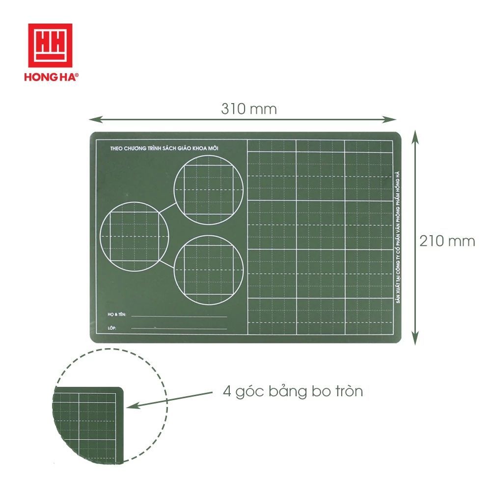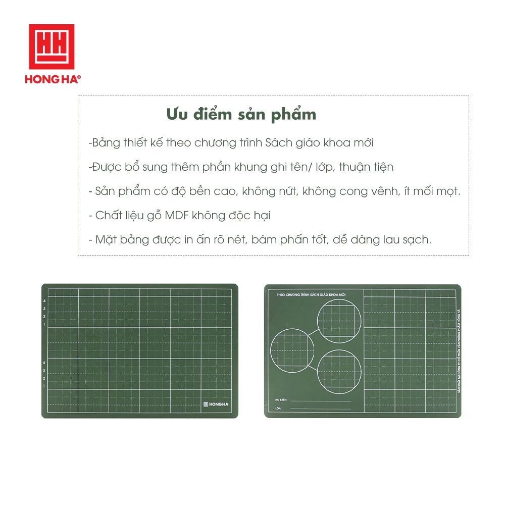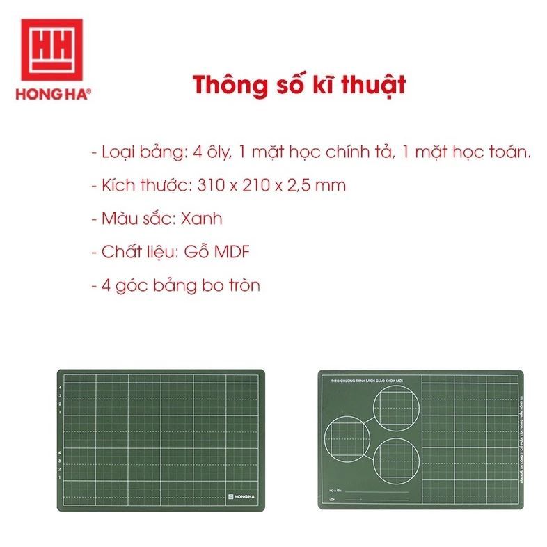 THÔNG SỐ KỸ THUẬT CỦA BẢNG GỖ HỌC SINH HỒNG HÀ- Loại bảng: 4 ly, 1 mặt học chính tả, 1 mặt học toán.- Kích thước: 310 x 210 x 2,5 mm, 4 góc bo tròn- Màu sắc: Xanh- Chất liệu: Gỗ MDFBảng được thiế...