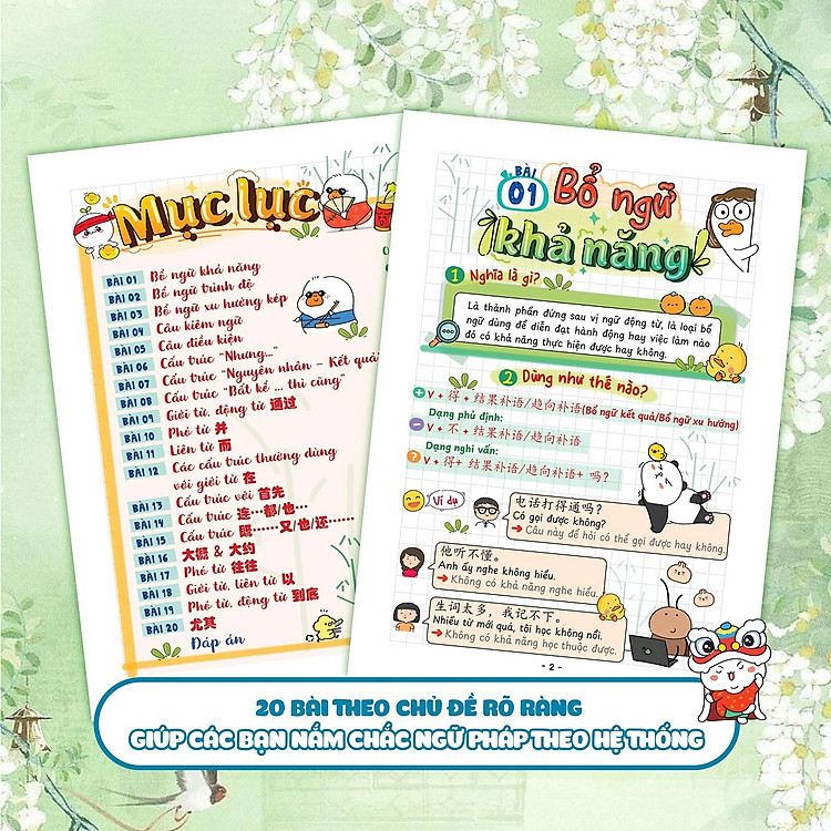 - Phân chia chủ đề ngữ pháp khoa học, rõ ràng: Gồm 20 bài học theo từng chủ điểm cụ thể, được sắp xếp từ dễ đến khó theo đúng khung năng lực HSK 4, giúp người học dễ dàng tiếp cận và ghi nhớ hệ thống. Bao phủ trọn vẹn các điểm ngữ pháp thường xuất hiện trong giao tiếp và đề thi, giúp bạn học chắc – dùng đúng – thi hiệu quả.