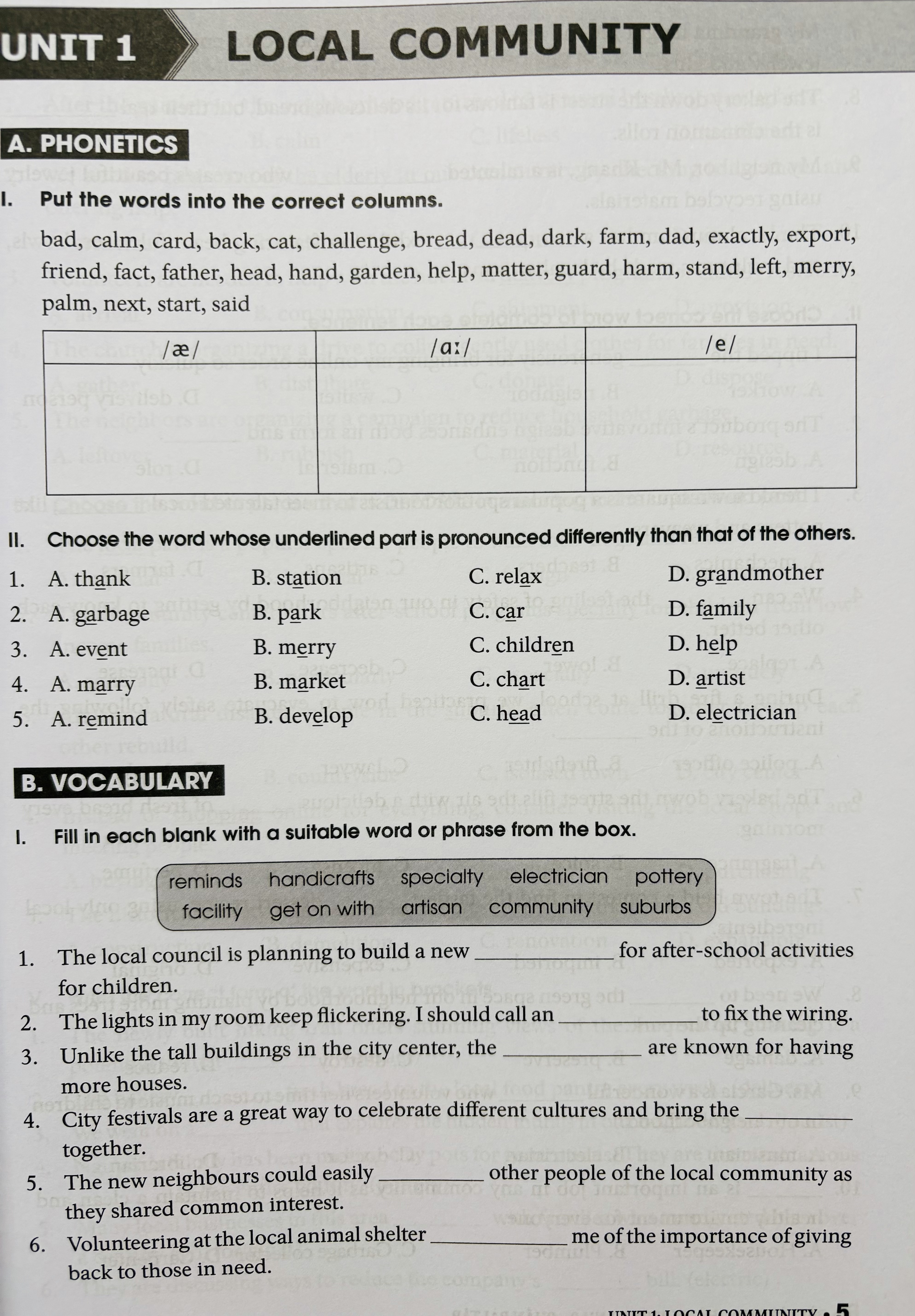 Mỗi đơn vị bài tập gồm 6 phần : Phonetics, Vocabulary and Grammar, Speaking, Reading, Writing