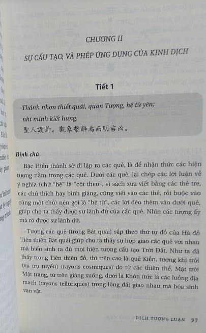 1/ Dịch Tượng Luận: Học Dịch rất khó. Khó vì, hiểu Dịch không phải ở hiểu Lời mà phải hiểu ở Tượng, nhưng cũng chưa phải ở Tượng mà ở Ý, vì "Ý tại ngôn ngoại". Tượng là biểu tượng, hình tượng, những hình tượng trong thiên nhiên chứa nhiều ý nghĩa của quy luật chung. Sự vật trong thiên nhiên vốn thiên hình vạn trạng, bậc thánh nhân xưa làm ra Kinh Dịch chỉ nhìn Tượng của sự vật mà đoán biết được Ý của thiên nhiên, tức Thiên ý, nghĩa là biết được những quy luật vận hành của vũ trụ vạn vật. Tiếp sau 2 quyển Dịch Kinh Tường Giải, Thượng và Hạ, giới thiệu tổng quát ý nghĩa của 64 quẻ, học giả Thu Giang Nguyễn Duy Cần giới thiệu tiếp đến bạn đọc phần khó hơn của Kinh Dịch đó là Tượng với tác phẩm Dịch Tượng Luận.