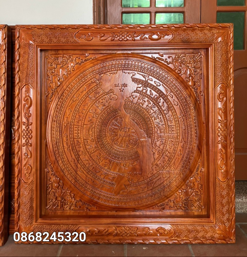 _ Tranh điêu khắc trống đồng đông sơn và giải hình chữ s bản đồ Việt Nam, được làm bằng bằng chất liệu gỗ hương đỏ tự nhiên 100%