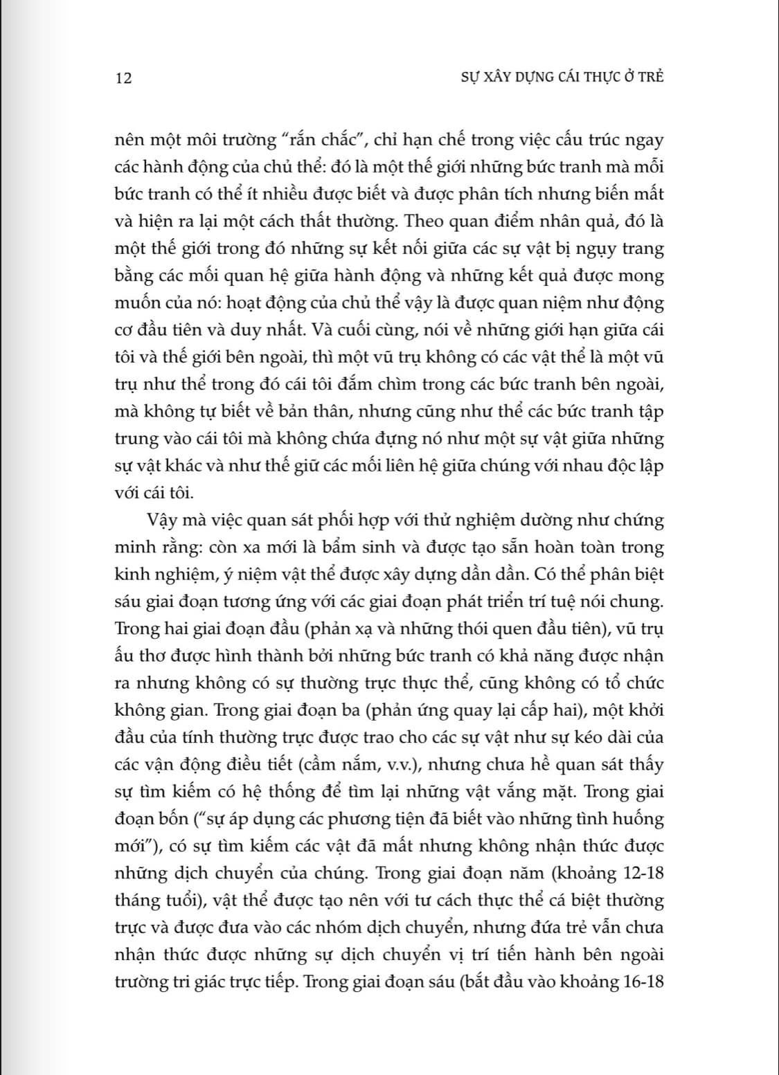 Sự xây dựng cái thực ở trẻ …. Việc nghiên cứu trí khôn cảm giác-vận động hay thực hành trong vòng hai năm đầu của sự phát triển[1] đã cho chúng ta biết đứa trẻ trực tiếp đồng hóa môi trường bên ngoài vào chính hoạt động của mình như thế nào, rồi tiếp đó, để kéo dài sự đồng hóa ấy, trẻ tạo nên ngày càng nhiều cấu trúc sơ khai (CTSK) vừa linh hoạt vừa có năng lực tự điều phối lẫn nhau ra sao. Vậy mà, song song với sự bao hàm tăng dần của các CTSK đồng hóa, ta có thể theo dõi sự tiến hóa liên tục của một vũ trụ bên ngoài, nói cách khác, sự phát triển đồng quy của chức năng giải thích [fonction explicative]. Thực vậy, mối liên hệ được xác lập giữa các CTSK đồng hóa càng nhiều lên thì sự tiến hóa càng bớt tập trung vào tính chủ quan đúng thực chất của chủ thể đồng hóa, để trở thành sự hiểu và diễn dịch đúng nghĩa. Chính như thế mà lúc khởi đầu hoạt động đồng hóa, một vật thể bất kì được môi trường bên ngoài đem đến cho hoạt động của chủ thể chỉ đơn giản là vật để mút, nhìn hay nắm giữ: vậy ở giai đoạn ấy, một sự đồng hóa như thế chỉ tập trung vào chủ thể đồng hóa. Trái lại, thời gian sau, cũng vật ấy biến đổi thành vật để dịch chuyển, để làm chuyển động và để sử dụng cho những mục đích ngày càng phức hợp. Cái cốt yếu vậy là trở thành tổng thể những mối quan hệ do hoạt động đặc thù [của chủ thể] kiến tạo nên giữa vật ấy với những vật khác: từ lúc ấy, đồng hóa có nghĩa là hiểu hay diễn dịch, và đồng hóa lẫn lộn với đặt các mối quan hệ. Bởi chính việc chủ thể đồng hóa đi vào mối quan hệ tương hỗ với các vật được đồng hóa: bàn tay cầm nắm, miệng mút, hay mắt nhìn, không chỉ hạn chế trong một hoạt động không có ý thức về bản thân nó mặc dù tập trung vào chính nó, mà chúng [bàn tay, miệng, mắt] được chủ thể quan niệm như những sự vật giữa các sự vật và như giữ những mối quan hệ tương thuộc với vũ trụ. Trích dẫn “Sự cố kết tăng dần giữa các cấu trúc sơ khai đi song đôi như thế với việc tạo thành một thế giới vật thể và các mối quan hệ không gian, nhân quả và thời gian, nói tóm gọn là với sự kiến tạo một vũ trụ “rắn chắc” và thường trực. … Trong những tháng đầu tiên của đời người, chừng nào sự đồng hóa vẫn tập trung vào hoạt động của chủ thể, thì vũ trụ không thể hiện vật thường trực lẫn không gian khách quan, cũng không thể hiện thời gian liên kết các sự kiện đúng với tư cách sự kiện lẫn tính nhân quả nằm bên ngoài chính hành động. ...Việc tổ chức cái thực này được thực hiện khi cái tôi tự thoát khỏi chính mình trong quá trình tự khám phá, và như thế tự định vị mình như một sự vật giữa các sự vật, một sự kiện giữa các sự kiện.” Giá sản phẩm trên Tiki đã bao gồm thuế theo luật hiện hành. Bên cạnh đó, tuỳ vào loại sản phẩm, hình thức và địa chỉ giao hàng mà có thể phát sinh thêm chi phí khác như phí vận chuyển, phụ phí hàng cồng kềnh, thuế nhập khẩu (đối với đơn hàng giao từ nước ngoài có giá trị trên 1 triệu đồng).....